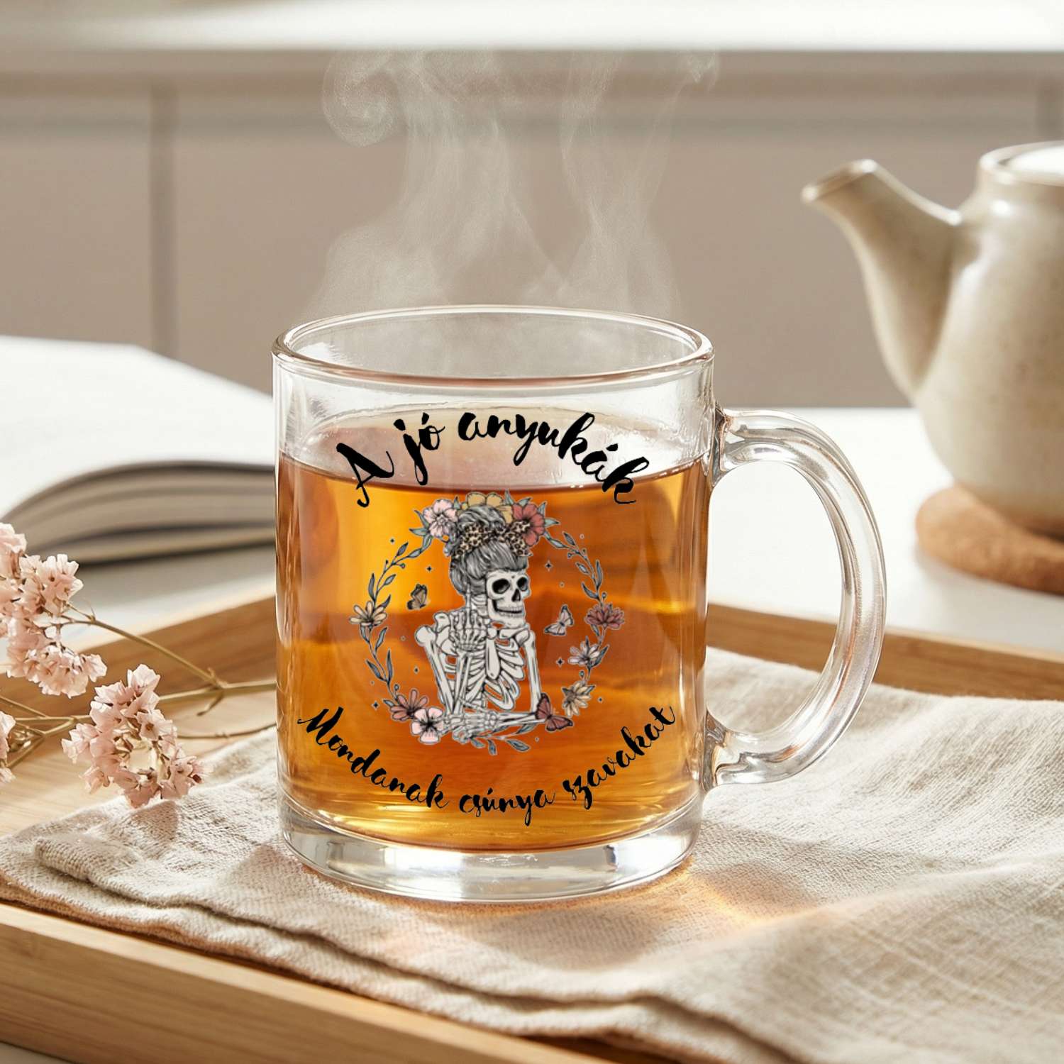 A jó anyaság nem a tökéletességről szól, hanem a türelemről – és néha annak a hiányáról is. Ez a vicces ajándék anyáknak egyfajta „túlélőkészlet” a hétköznapokra. A stílusos, virágos és koponyás grafika egyszerre vadóc és kedves, így tökéletesen tükrözi a modern anyukák sokszínűségét.
